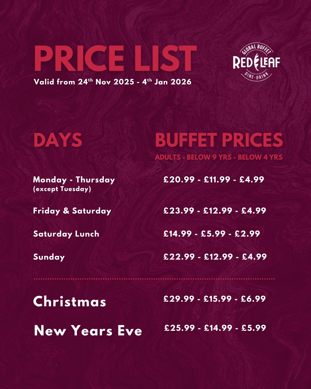 Welcome to Red Leaf , where you can enjoy international cuisines, from flavorful Asian delights to delicious European classics